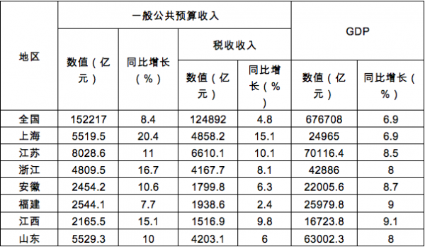 2015年一般公共预算收入高于表中七个省(市)平均值的有: