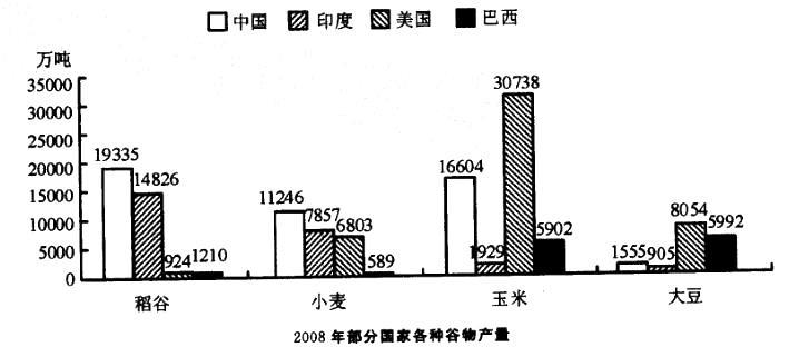 根据材料,美国大豆产量为8054万吨,中、印、巴三个国家总计为8452万吨,世界总量为23095.3万吨,其他国家总产量为6589.3万吨,则不可能有其他国家超过美国,所以选A。
