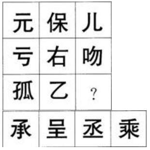 题干及选项中仅有汉字,考虑笔画数,如下表[img]/upload/tiku/292/4924716_1.jpg[/img]每行、每列笔画数之和均为15,需选一个笔画数为6的汉字。故本题答案为C。