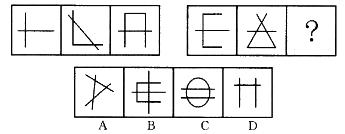 第一组图中吴个图形的线头数均为4个,第二组图中的前两个图形的线头数也为4 个,所以只要第三个图形的线头数也为4个,就符合规律,故本题选C。
