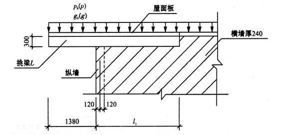 根据《砌体结构设计规范》(GB 50003—2011)第7.4.6条规定,挑梁埋入深度l1与挑出长度l之比宜大于1.2,当挑梁上无砌体时,l1与l之比宜大于2,即l1>2×1.38=2.76m。
