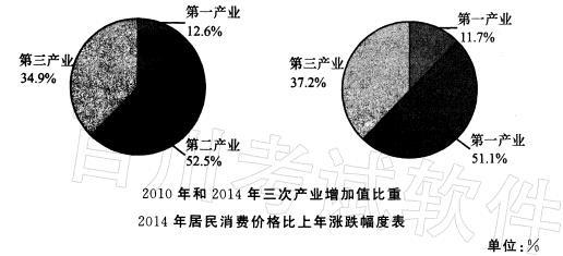 根据资料中的2010年和2014年三次产业增加值比重图,可以看出A项正确。根据表格资料可知,烟酒的价格有所下降,B项错误。根据资料“该省2014年全省生产总值实现29421.2亿元,比上年增长6.5%……民营企业经济增加值实现19894.4亿元,比上年增长7.5%”可知,部分增长速度高于整体增长速度,比重应有所上升,C项错误。D项,从资料中无法推出“持续上升”,错误。故本题选择A项。