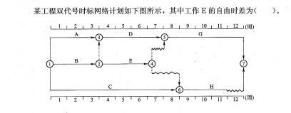 :在双代号时标网络计划中,以终点节点为完成节点的工作,其自由时差 与总时差相等;其他工作的自由时差就是该工作箭线中波形线的水平投影长度。但当 该工作之后紧接虚工作时,则该工作箭线上一定不存在波形线,而其紧接的虚箭线中 波形线水平投影长度的最短者为该工作的自由时差。如图所示,E工作不是以终点节 点为完成节点妁工作,其紧接虚箭线波形钱的水平投影长度最短为一周。见教材第四 章第五节P243【考核要点】:双代号时标网络计划确定自由时差。
