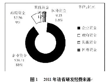 2011年,某省全社会研发经费达612.93亿元,R D9(研发)经费占GDP的比重达1.9%。比2010年提高0.12个百分点。2011年,该省专利申请量和授权量分别达16.5万件和13万件。同比增长35%和11.7%。2011年,该省技术市场合同成交额68.2928亿元。2011年,该省每万元GDP能耗0.590吨标准煤。