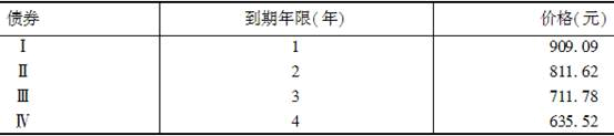 面值为1000元的零息债券Ⅰ、Ⅱ、Ⅲ和Ⅳ的到期年限和价格如表2-2所示,则下列说