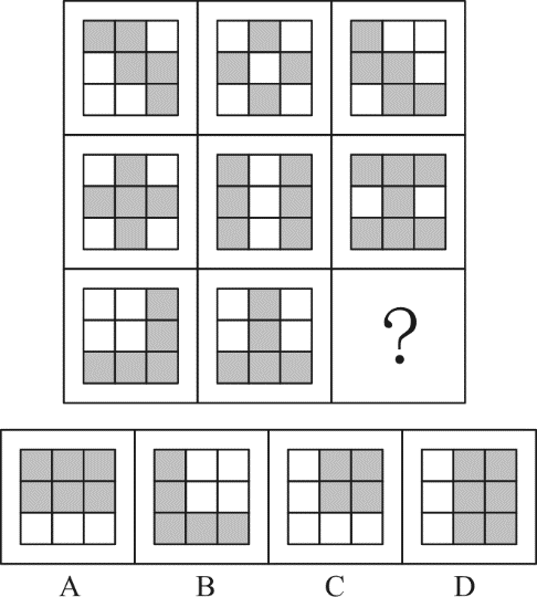 第一步,观察特征。组成元素相似,并且所有图形外部轮廓相同,内部填充不同,优先考虑定义叠加。第二步,九宫格,横向规律较为常见,优先考虑。第一行:黑+白=黑,白+黑=黑,白+白=白,黑+黑=白;第二行经验证符合此规律;第三行应用此规律,只有C项符合。
