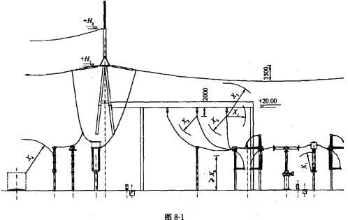 500kV配电装置采用软母线,导线直径为50mm,其局部断面图如图8-1所示(母线挂线点髙度为20m,导线弧垂尺寸,跨线为3500mm,母线弧垂为2000mm),请根据以下各题要求分析(或计算)回答问题。