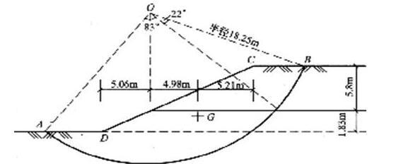 边坡几何尺寸如图7所示。滑坡体的面积为150m2。边坡土层由两层土组成,从坡顶到埋深5.8m处为第一层,其黏聚力c=38.3kPa,ψ=0;以下为第二层,其黏聚力C=57.5kPa,ψ=0。两层土的平均重度为γ=19.25kN/m3。若边坡以O点为圆心做滑弧滑动,则该边坡的稳定系数为( )。