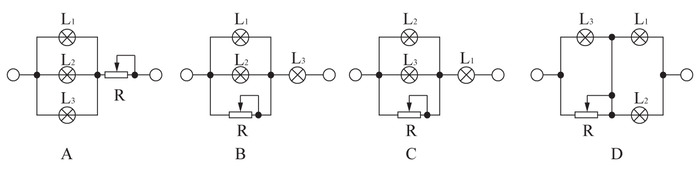 三盏灯泡L1(110V、100W).L2(110V、40W)和L3(110V、25W),电源所能提供的电压为220V,在图示的四个电路中,能通过调节变阻器R使电路中各灯泡均能够正常发光且最省电的一种电路是________。