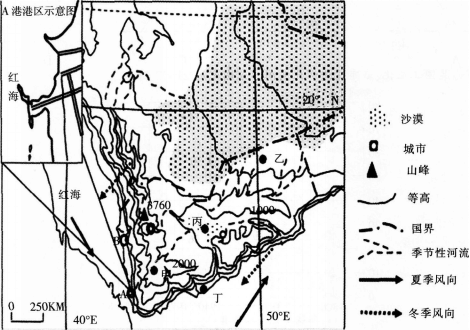 摩卡咖啡生长需要静风、温凉、湿润、排水条件好的环境,图中南部国家是世界上重要的摩卡咖啡生产地。A港口一度成为重要咖啡输出港,如今弃置。现主要通过B港出口。据此回答题。