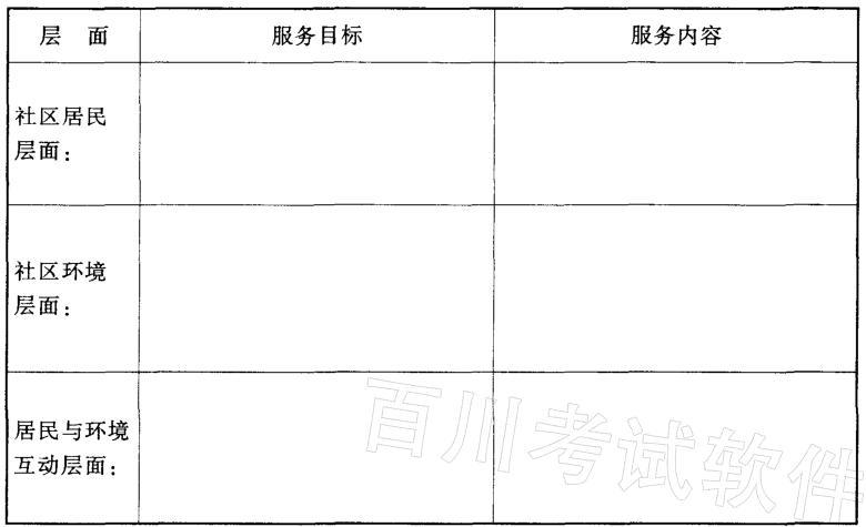 某小区是去年由于7个村拆迁安置而形成的近一万人的“农转居”社区,社区内没有 幼儿园,离中小学较远,没有大型的超市、农贸市场,也没有社区活动中心。新的居住方 式改变了原来村落的人际关系和支持网络,社区内人际互动较少,缺乏活力。中老年人 无事可做,无处可去,学龄儿童无处可玩。社区只有几个零散的文艺兴趣小组,一些原村 落的文艺骨干不主动参与社区活动。楼道里乱堆乱放杂物,影响了人们正常行走。大部 分社区居民不适应“农转居”后的生活,普遍有一种不满情绪。新建的社区居委会却原居 委会改组而成,工作人员缺乏城市社区工作经验。 对此,当地政府引进一家社会工作服务机构开展服务。社会工作服务机构经过调査 后,制订了以协助居民“农转居”生活方式为目标的社区服务计划。要求:结合本案例,依据“人在情境中”的基本观点,分别从居民、环境、社区居民与 环境互动三个层面,设计具体的社区服务方案(只需把各层面的服务目标和内容填人答 题卡的相应表格内)。要求:结合本案例,依据“人在情境中”的基本观点,分别从居民、环境、社区居民与 环境互动三个层面,设计具体的社区服务方案(只需把各层面的服务目标和内容填人答 题卡的相应表格内)。