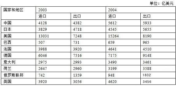2004 年的出口额比2003 年增加最多的国家是()