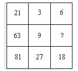 A. 27 B. 8 C. 21 D. 18D每行前两个数字之差除以3等于第三个数。(63-9)÷3=(18)。故答案为D。