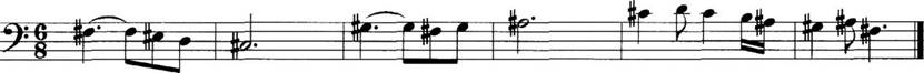 旋律中出现了#F、#E、#C、#G、#A,最后音落在#F上,若为#F大调的话,调号应为六个升号(#F、#C、#G、#D、#A、#E),但是D音没有升高,相当于降低,符合#F和声大调降低第四级音的条件,所以为#F和声大调。