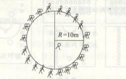 某中学初一(3)班,学生40人,教学内容为原地双手头上掷实心球。王老师在这节课的准备活动部分组织学生围绕圆周(R= 10m)进行慢跑热身,引导学生沿着圆周做行进间徒手操。在课堂的运动技能教学部分,王老师站在圆周直径的三分之二处,面向多数学生讲解原地双手头上掷实心球的动作要领,并进行了一次示范。王老师还安排了学生做原地双手无球前掷的动作训练,以掌握技术要领。(教学组织形式见图)