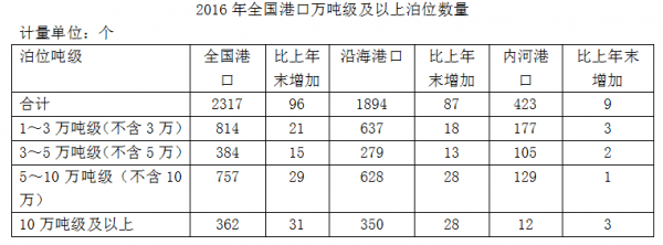 2016年末,全国港口拥有生产用码头泊位30388个,比上年减少871个。其中,沿海港口生产用码头泊位5887个,减少12个;内河港口生产用码头泊位24501个,减少859个。全国港口拥有万吨级及以上泊位2317个,比上年增加96个。其中,沿海港口万吨级及以上泊位1894个,增加87个;内河港口万吨级及以上泊位423个,增加9个。全国万吨级及以上泊位中,专业化泊位1223个,比上年增加50个;通用散货泊位506个,增加33个;通用件杂货泊位381个,增加10个。