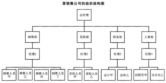 从图中可以看出,各个职能部门和人员都只能负责某一个方面的职能工作,唯有最高领导才能纵观全局,因此,它符合职能制的特点,即管理权力高度集中。所以该公司的组织形式为职能制。 管理跨度,就是一个上级直接指挥的下级数目。该公司总经理直接管理销售部、采购部、财务部和人事部,管理跨度为4。 该公司的管理层级有总经理、经理和员工,共3个层级。 关键职能是在企业管理组织所具备的各项职能中,对实现企业战略起着关键作用的职能,对于该公司而言,销售为其关键职能。 该公司分为四个部门,互不统属、相互分工合作的组织体制,属于职能制的分工形式。