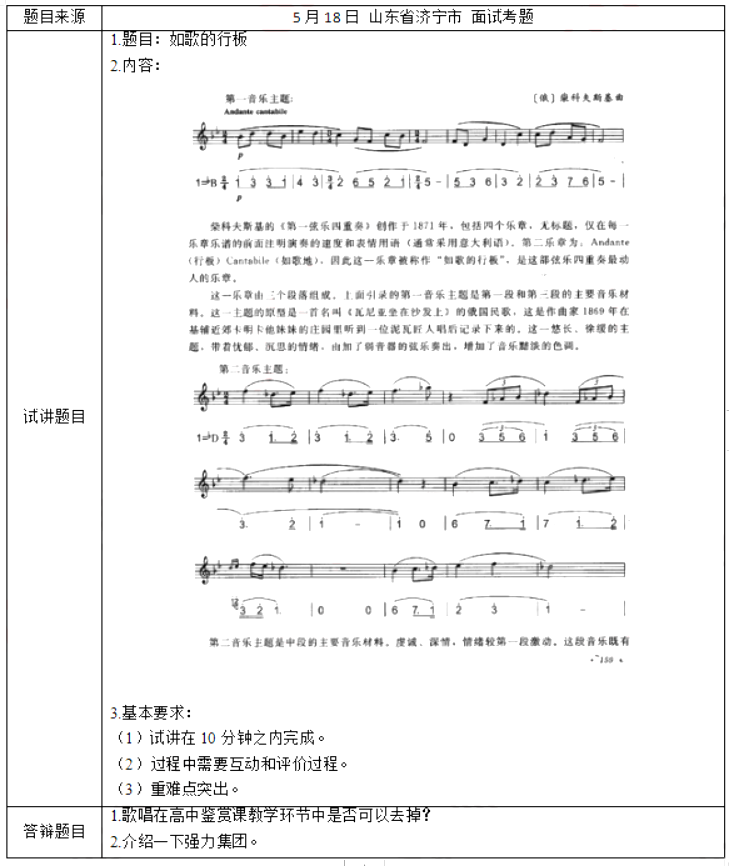 二、考题解析【教学过程】(一)情境导入1.教师在课堂伊始播放乐曲,设问:同学们,我们刚才欣赏的是什么风格的音乐?(俄罗斯)教师追问:大家感觉俄罗斯音乐有什么特点呢?(充满诗意、深情、宁静、忧伤)2.老师讲解,1877年俄国大文学家列夫·托尔斯泰听了柴可夫斯基的一部音乐作品后,竟感动得热泪盈眶,他说:“已经接触到忍受苦难的人民的灵魂深处”这究竟是一首怎样的乐曲呢?以此带领学生欣赏《如歌的行板》。(二)初步感知1.介绍作曲家,播放视频资料,柴可夫斯基以及他的作品剧照。柴可夫斯基,俄国作曲家,生于贵族家庭。他是一个善良、忧郁的音乐诗人,被奉为世界级音乐旋律大师,也是浪漫乐派代表之一。他动人的音乐深深地打动了全世界人民,提到俄国音乐家,往往第一个就会想到他,可以说他是俄国民族音乐继承者与西方音乐的汲取发扬者。他创作的作品中,有大家所熟悉的舞剧《天鹅湖》《睡美人》《胡桃夹子》和交响诗《罗密欧与朱丽叶》《悲怆》等。2.聆听音乐《如歌的行板》并作背景介绍。1869年,青年柴可夫斯基住在他妹妹的家里。一天忽然听到窗外粉刷墙壁的泥水匠在哼唱一支动人的民歌,柴可夫斯基立即被这支淳朴优美而又婉转凄恻的民歌吸引住了。第二天,他找到了唱歌的匠人,把民歌记录下来,配上和声,收进了他在这一年中编成的《俄罗斯民歌五十首》。两年以后,他在写作《D大调弦乐四重奏》的时候,又用这首民歌作为第二乐章的主题,这第二乐章就叫《如歌的行板》。(三)探究学习全曲由两个主题交替反复而成。乐曲的第一部分由三个乐段构成。1.聆听主题一聆听并设问:同学们,这段旋律给你怎样的感觉?(旋律委婉,给人忧郁、沉思的印象,情绪十分压抑。)教师总结:第一乐段的旋律用变奏的手法重复了一遍,这就是第一主题,也就是《凡尼亚坐在沙发上》的民歌曲调,由四二拍与四三拍混合作成,但是过渡却很自然、流畅。2.聆听主题二聆听并设问:同学们,从这两段旋律中,你感受了什么样的音乐情绪?特别注意大提琴的固定音型,制造了怎样的气氛?(前一段带有忧郁的情调,好像在祈求什么;后一段的情绪则悲伤而不安。特别是大提琴拨奏的固定音型及两个内声部的切分音伴奏,犹如沉重的脚步声和不断的喘息声,从而使忧郁不安的情绪更为鲜明地突显出来。)教师总结:第二乐段的旋律是第一乐段的变奏:此后,再重复第一乐段的内容。乐曲的第二部分也就是第二主题,由两段旋律构成。3.聆听再现主题,在教师的引导下,全班讨论此曲的音乐特征和给大家心灵上的震撼。4.教师总结:乐曲的第三部分是第一部分的变化再现,它好像有说不完的痛苦,又好像在千方百计地寻找解脱痛苦的方法。作品色彩忧郁、朦胧、暗淡,旋律淳朴优美而又婉转凄恻,似诉说、似哭泣、似叹息。这首《如歌的行板》,以轻吟低回、如泣如诉的琴声传达了沙俄时代专制统治下人民的悲惨生活与难言的苦楚,这就是让列夫·托尔斯泰老泪纵横,并说:“我已经接触到忍受苦难的人民的灵魂深处”的原因。5.重点聆听第一主题音乐并学唱。(四)拓展延伸1.教师讲解室内乐及其相关音乐知识,学生聆听理解。室内乐原指在客厅、房间内演奏的“家庭式”音乐,在室内乐作品中,弦乐四重奏具有重要的、代表性的地位。通常,弦乐四重奏由第一小提琴、第二小提琴、中提琴、大提琴四个声部组成。2.欣赏本课歌曲《夜曲》,并进行模唱,并提问:刚才大家演唱了部分俄罗斯民歌,那你们听过这首歌曲吗?3.教师总结:歌曲《夜曲》是用《如歌的行板》第一主题音乐再填上歌词而成。《夜曲》有很多填词,大多数表现伤感的爱情内容。4.教师引导学生跟音乐模唱,后纠正不准确的地方。(五)小结作业《如歌的行板》旋律深沉、婉转、凄美,体现了作者对人生艰辛的感悟,对劳动人民苦难生活的深切同情和无可奈何,一首音乐能让我们感受如此深刻,带给我们这么多震撼,这就是音乐的魅力。作业:课下搜集曲作者的相关介绍。【板书设计】[img]/upload/tiku/397/10752628_1.png[/img]【答辩题目解析】1.歌唱在高中鉴赏课教学环节中是否可以去掉?【参考答案】歌唱时实践性很强的学习内容,是培养学生音乐表现能力和审美能力的有效途径。普通高中歌唱教学应在九年义务教育音乐教学的基础上得到提高与发展。要注意培养、发展学生演唱歌曲的兴趣与爱好,增强演唱的自信心;发展学生的表演潜能及创造潜能,使他们能够运用歌唱的形式表达个人的情感并与他人沟通、融洽感情。引导学生用健康的审美意识规范自己的歌唱实践,并在其中享受到美的愉悦,得到情感的陶冶和升华。2.介绍一下强力集团。【参考答案】强力集团是一个作曲家集体,这个团体有五位作曲家,包括巴拉基列夫、居伊、穆索尔斯基、鲍罗丁、里姆斯基-科萨科夫。人们也称他们为“五人团”,他们自称为“新俄罗斯乐派”。