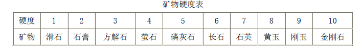 本题考查的是岩体的结构。在是工作中常用可刻划物品来大致测定矿物的相对硬度,如指甲约为 2~2.5 度,小刀约为 5~5.5 度,玻璃约为 5.5~6 度,钢刀约为 6~7 度。