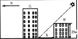 当地纬度为21°34′N,则当太阳直射南回归线时,该地太阳高度角达一年中最小值,因此当地的最小太阳高度角为90°一纬度差(21°34′+23°26′)=45°,利用正弦的余切值计算出楼间距与甲楼的高度相等,为25m。