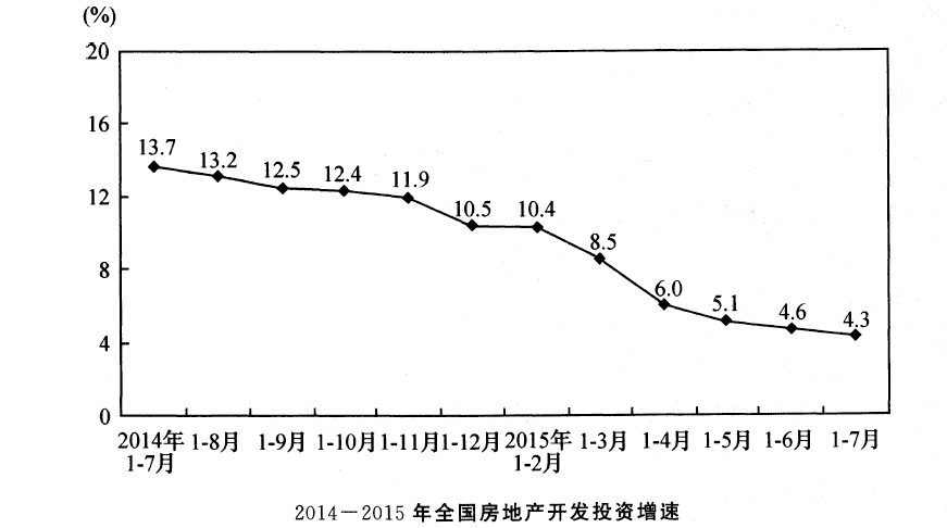 2015年1—7月份,全国房地产开发投资52562亿元,伺比名义增长4.3%,增速比1—6 月份回落0.3个百分点。其中,住宅投资35380亿元,增长3.0%,增速提高0.2个百分点。