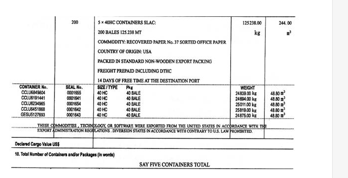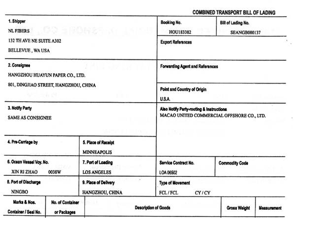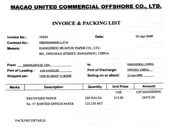 杭州华云纸业有限公司(3301910221)从境外采购废纸(法定计量单位为千克)