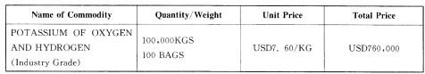 (2) Packing:In P. P. BAGS(3) Portof Loading:CHONGQING PORT, CHINA(4) Port of Destination:NEWYORK PORT,U. S.(5) Shipping Mark: HAWK — LAND(6) Date of Shipment:Sep. 2012 ,/ By Vessel(7) Terms of Payment : L/C(8) Documents Required:Certificate of Quality Issued By CIQ showing the number of L/C. Buyer The Seller