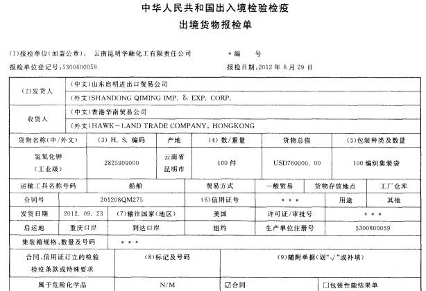 山东启明进出口贸易公司(自理报检单位备案号3 7 O 7 6 O O 5 7 3)与香港华南贸易公司(H A W K -LAND TRADE COMPANY, HONGKONG)签订外贸合同出口工业级氢氧化钾。货物生产商为云南 昆明华融化工有限责任公司(自理报检单位备案号5S00600059)。请根据所提供的材料判断《出境货物 报检单》有关内容的正误。注意:下面的表看沃德文件或参考去年的:出境货物报检单可以单独排一页。SALES CONTRACTNo. : 201208QM275Date: Aug. 15,2012The Buyer: HAWK — LAND TRADE COMPANY,HONGKONGThe Seller: SHANDONG QIMING IMP. EXP. CORP.This contract is made by and between the Seller and the Buyer, whereby the Seller agrees to sell and the Buyer agrees to buy the under— mentioned goods according to the terms and conditions stipulated below ;(1)