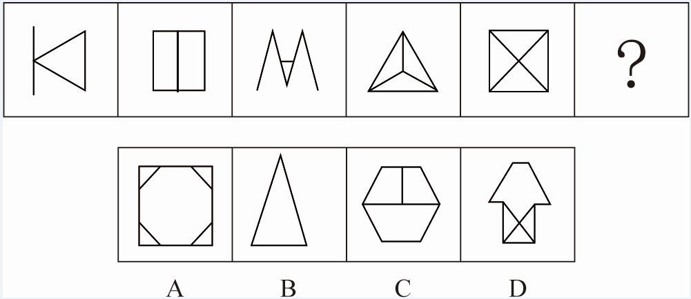 第一步,观察特征。组成元素不同,优先考虑数量类或属性类。图形对称特征明显,考虑对称性。第二步,一条式,从左到右找规律。题干图形对称轴的个数依次为1、2、1、3、4,继续观察图形均出现多个封闭空间,图形面的个数依次为1、2、1、3、4,发现图形对称轴的个数与面的个数相同,即对称轴个数减面的个数为0,问号处图形对称轴的个数应该与面的个数相同,只有B项符合。