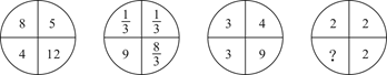 第一步,本题考查数图推理。第二步,观察图形中数字发现8+12=4×5,,3+9=3×4,规律为左上角数字+右下角数字=左下角数字×右上角数字,可得2+2=所求项×2,则所求项为2。