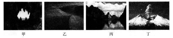 甲为海浪侵蚀地貌,乙为风力堆积地貌,丙为流水侵蚀地貌,丁为火山喷发作用形成的火山。