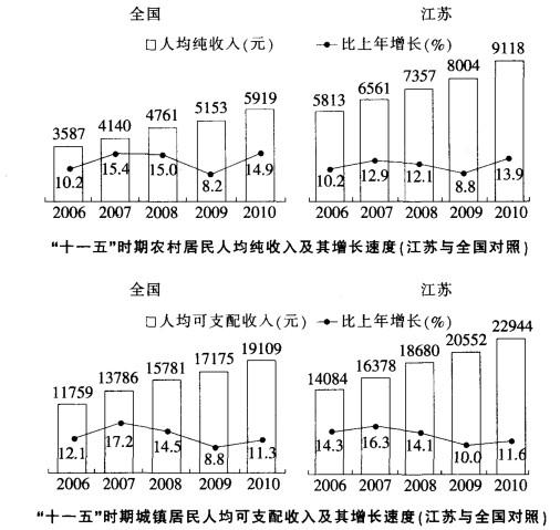 2010年江苏农村居民人均纯收入、城镇居民人均可支配收入分别比全国平均水平高