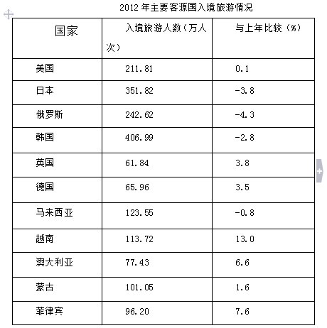 2012年,全国国内旅游人数29.57亿人次,比上年增长12.0%。其中,城镇居民19.33亿人次。2012年,全国国内旅游收入22705.22亿元人民币,比上年增长17.6%。2012年全年入境外国游客人数比上年增长0.3%,其中,亚洲市场入境人数1664.88万人次,与上年基本持平,占入境外国游客人数的61.2%;欧洲市场入境人数592.16万人次,增长0.2%;美洲市场入境人数317.95万人次,减少0.7%;大洋洲市场入境人数91.49万人次,增长6.5%;非洲市场入境人数52.49万人次,增长7.4%。