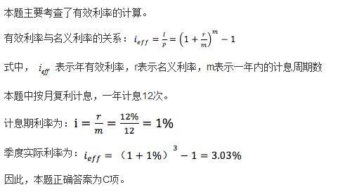 已知年利率12%,每月复利计息一次,则季实际利率为( ) A. 1.003% B. 3.00% C. 3.03% D. 4.00%