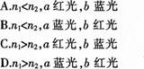 由图可知,b光线经过三棱镜后的偏折角较小,因此折射率较小,是红光。三棱镜对红光的折射率小于蓝光,即n1
