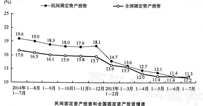 2015年1一7月份,民间固定资产投资187534亿元,同比名义增长11.3%,增速比1一6月份回落0.1个百分点,比全国固定资产投资(不含农户)增速高0.1个百分点。民间固定资产投资占全国固定资产投资(不含农户)的比重为65%。