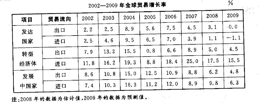 本题属于直接观察题。直接观察表格可知,2008年进口增长率最低的是发达国家。 所以选择A选项。