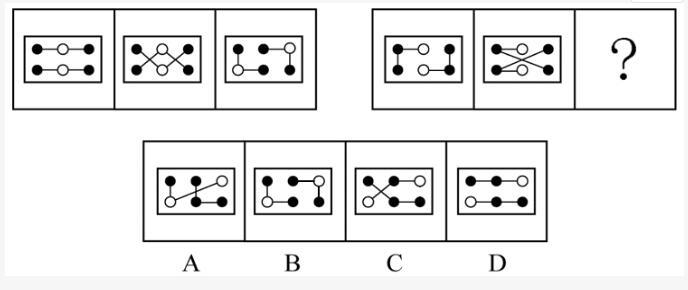 第一步,观察特征。每个图均由黑球、白球组成,且被一根线串联,优先考虑连接性。第二步,两段式,第一段找规律,第二段应用规律。第一段各图形均为黑球-白球-黑球组合,第二段前2个图形均为黑球-黑球-白球组合,连接性如下表所示:[img]/upload/tiku/378/9781848_1.jpg[/img]由以上表格得,问号处图形应该为直线式,只有D项符合。因此,选择D选项。