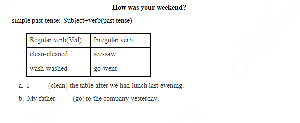 1. Simple past tense is a tense used to describe things happened in the past. When we use it, we need to change the verb into past tense. The verbs are changed in regular form or regular form. Regular verb only needs to add -ed at the end of a word, while irregular verbs have various forms. I will now show an example: My friend looked at me when I touched him. So that’s my understanding of simple past tense.2.Grammar can be a little boring for students. But it is essential to learn English. So different activities can be arranged to attract their attention. For example, in the warming-up, I sang a song called Yesterday Once More so that they will know this grammar point is around us and frequently used. Then, in the presentation part, I will let the students take the initiative to find the rules of simple past tense. At last, I asked students to talk about their daily lives and share stories or jokes with simple past tense, so they will use the tense and do not get bored with much mechanical drilling. So I believe they will be interested in my grammar lesson.