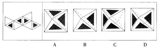 题图折叠后是正八面体,分为上下两部分后,不会有三个黑色面在同一部分,故排除A、C、D。