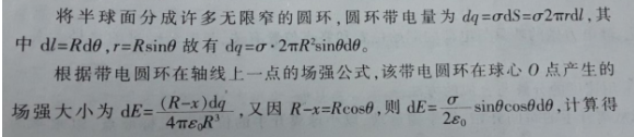 一半径为R的半球面,均匀地分布着电荷面密度为盯的电荷,则球心处的电场强度是多少