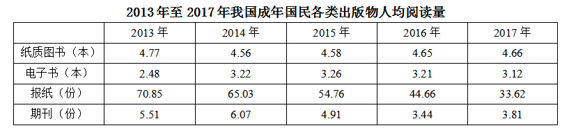 2017年我国成年国民图书阅读率为59.1%,比上年增加0.3个百分点;报纸阅读