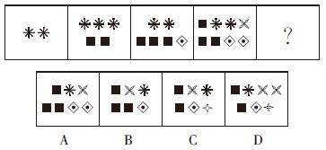 前一个图形增加一种小图形得到后一个图形,且该种小图形在下一个图形中的数量比前一个图形中的数量多1。故本题选D。