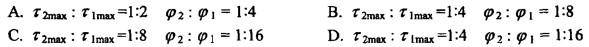 受扭实心等直圆轴,当直径增大一倍时,其最大切应力τ2max和两端相对扭转角 φ2与原来的τ1max和 φ1的比值为( )。