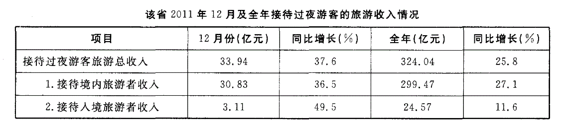 2011年某省接待过夜游客总量再次实现突破,达到3001. 34万人次,同比增长16. 0%。 实现旅游收人324. 04亿元,同比增长25. 8%。12月份宾馆平均开房率为74. 02%,同比增长 0.06%;全年累计宾馆平均开房率为62. 37%,同比增长2.0%。
