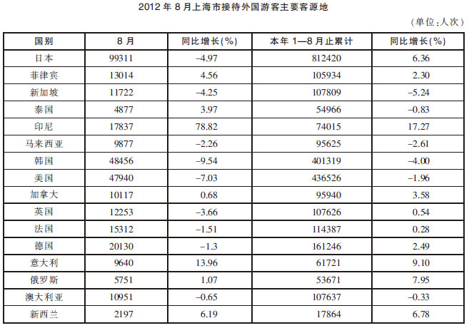 2012年8月上海市接待外国游客主要客源地(单位:人次) 关于上海