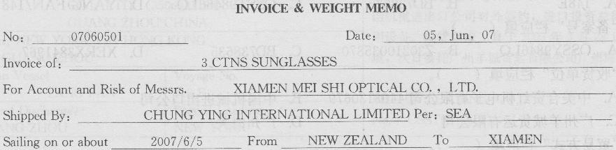(十二)厦门美视光学工业有限公司于2007年4月出口一批太阳眼镜,货物经香港运至