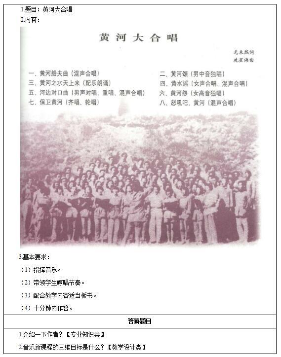 高中音乐《黄河大合唱》 主要教学过程及板书设计(一)教学过程环节一:创设情境多媒体播放黄河雄伟壮观的场面,请学生用自己的语言来描述对黄河的印象,播放背景音乐《黄河协奏曲》的片段,引出作品《黄河大合唱》。环节二:赏析探究1.请学生拿出课前收集的资料,讨论对于《黄河大合唱》有哪些了解?学生讨论之后,教师根据情况就作品的作者和创作背景进行适当的补充。2.播放乐曲,请学生闭眼聆听,在脑海中想象那幅画面,并思考:从乐曲中感受到了什么?作品可分为几部分?分别采用怎样的声乐演唱形式?学生自由回答,教师总结:慷慨、宏伟的气势。全曲分为八个部分:《黄河船夫曲》(混声合唱)、《黄河颂》(男中音独唱)、《黄河之水天上来》(配乐朗诵)、《黄水谣》(女声合唱、混声合唱)、《河边对口曲》(男声对唱、重唱、混声合唱)、《黄河怨》(女高音独唱)、《保卫黄河》(齐唱、轮唱)和《怒吼吧,黄河》(混声合唱)八个乐章组成。3.分段欣赏①欣赏《黄河船夫曲》,聆听并思考:这段音乐有什么特点?描述了什么场面?总结其音乐材料的重复性,节奏的律动性,运用了船夫号子的音乐素材,描绘了船夫们与风浪搏战的动人场面。②欣赏《黄河颂》,聆听并思考:有哪些音乐要素发生了变化?表达了怎样的情感?分析音乐的旋律、情感特征以及男中音热情、深切的演唱,结合诗词波澜壮阔的描述,表达了人民对黄河的赞颂。③欣赏《保卫黄河》,聆听并思考:表现了怎样的情绪?了解其激昂的情感特点。请学生随着音乐哼唱,并学习指挥的手势,之后随音乐指挥。环节三:巩固提高请学生对《黄河之水天上来》进行配乐诗朗诵,并认真体会诗词的意境。环节四:小结作业小结:《黄河大合唱》是一部具有交响性和史诗性的大合唱。它既有对黄河奔腾咆哮、一泻千里的磅礴气势的描述,又揭示了中华民族遭受屈辱、苦难与不幸,同时还刻画了中国人民英勇顽强、不屈不饶的斗争精神。作业:收集更多冼星海的作品,感受其民族精神。(二)板书设计黄河大合唱冼星海黄河大合唱的创作背景八个乐章答辩题目解析:1.介绍一下作者?【专业知识问题】【参考答案】冼星海祖籍广东番禺,出生于澳门,中国20世纪30年代杰出音乐家、音乐教育家。曾任延安鲁迅艺术学院音乐系主任,培养了许多音乐人才,对解放区音乐发展具有重要的影响。其一生创作了数百首歌曲和四部大合唱,是现代声乐创作中最多产、最有影响力的作曲家。其代表作品包括《救国军歌》《青年进行曲》《到敌人后方去》《在太行山上》《夜半歌声》《只怕不抵抗》《黄河大合唱》和《生产运动大合唱》等优秀作品。其代表作《黄河大合唱》是中国近现代音乐史上里程碑式的杰作。由于他对音乐创作、音乐教育、音乐活动等方面的重要贡献,逝世后被誉为“人民的音乐家”。2.音乐新课程的教学目标体现的三维目标是什么?【教学设计问题】【参考答案】1.情感态度与价值观,其包括丰富情感体验,培养对生活积极乐观的态度,培养兴趣,树立终身学习的愿望,提高音乐审美能力,陶冶高尚情操,培养爱国主义感情,增强集体主义精神,尊重艺术,理解世界文化的多样性。2.过程与方法,其包括体验、模仿、探究、合作、综合。3.知识与技能,其包括音乐基础知识、音乐基本技能、音乐历史与相关文化知识。