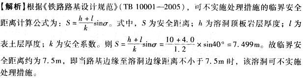 若在勘察设计中发现某路基附近有溶洞发育,以测定溶洞顶板岩层厚10m,表土层厚 4.0m,当路基边缘至溶洞边缘距离不小于( )m时,该溶洞可不实施处理措施。...