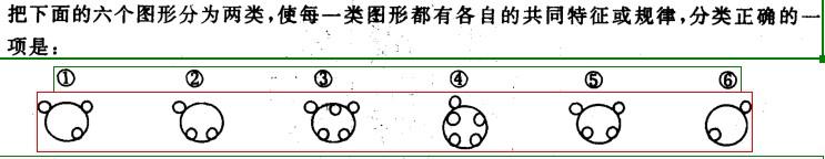 A [解析]本题属于数量类,考查的是图形中元素的个数。观察可发现,題目中所给 的6个图形都相似,小闽的总个数没有明显规律,可分大圆内部和外部来看,①③⑤中大圓外 部小圆的个数均为2,②④⑥大圆外部小圆的个数均为1.正确答案为A。